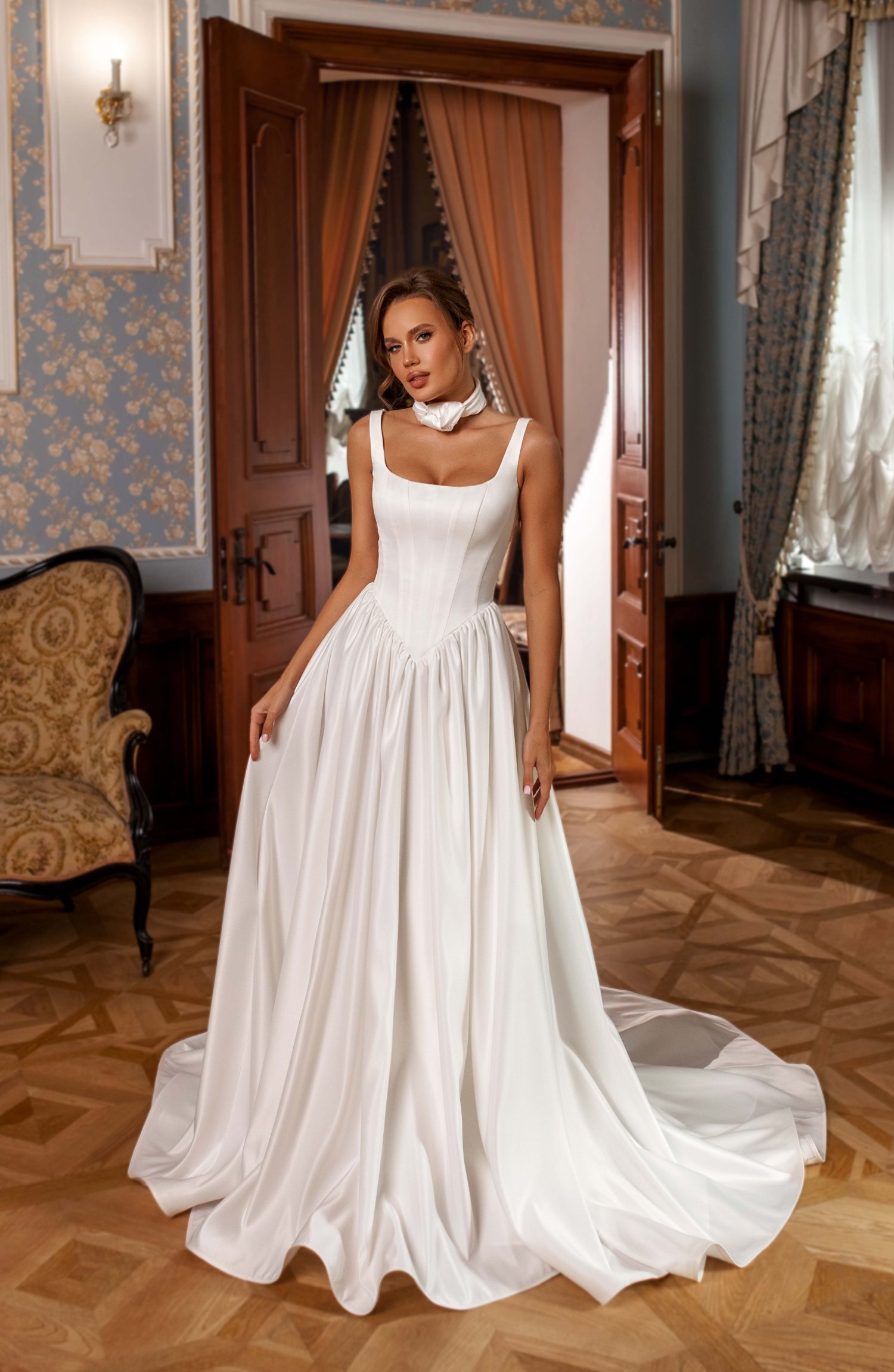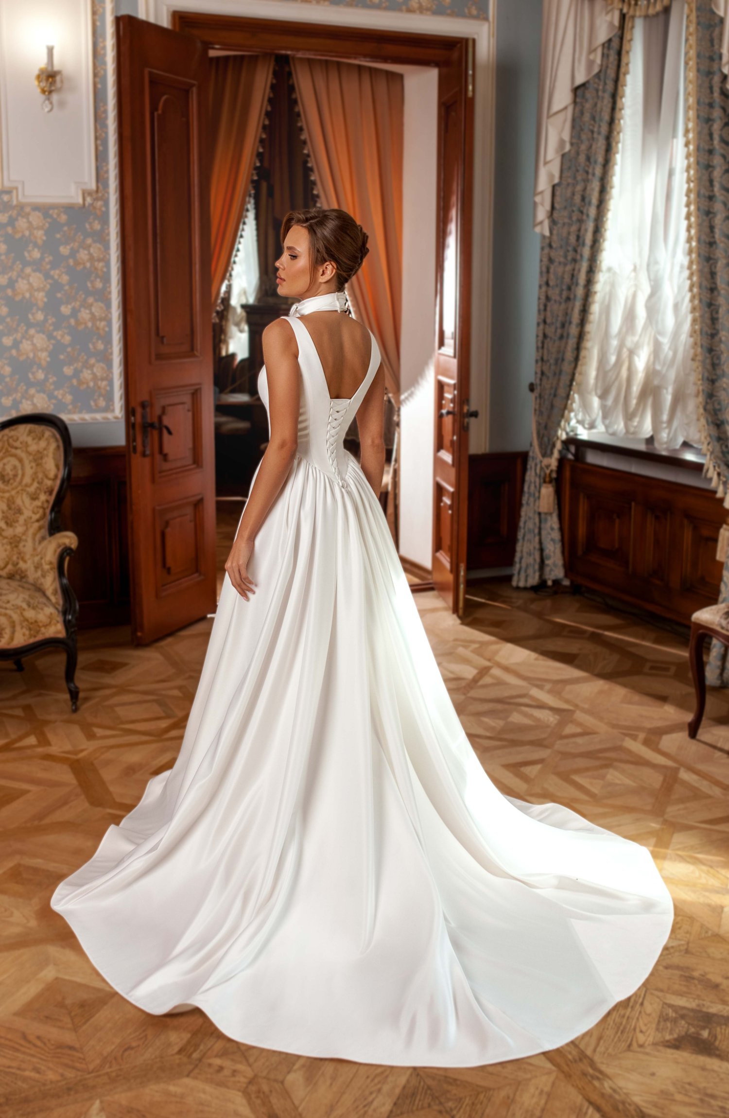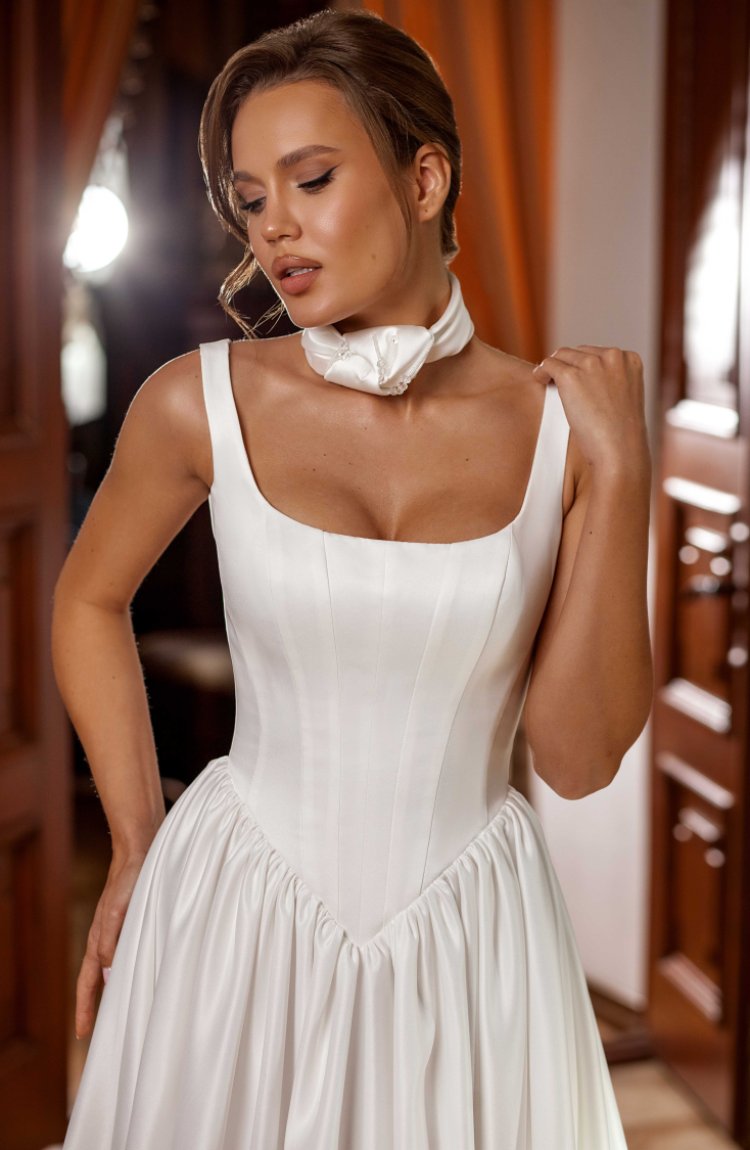 Платье свадебное А силуэта с модными конструктивными решениями из классического атласа .