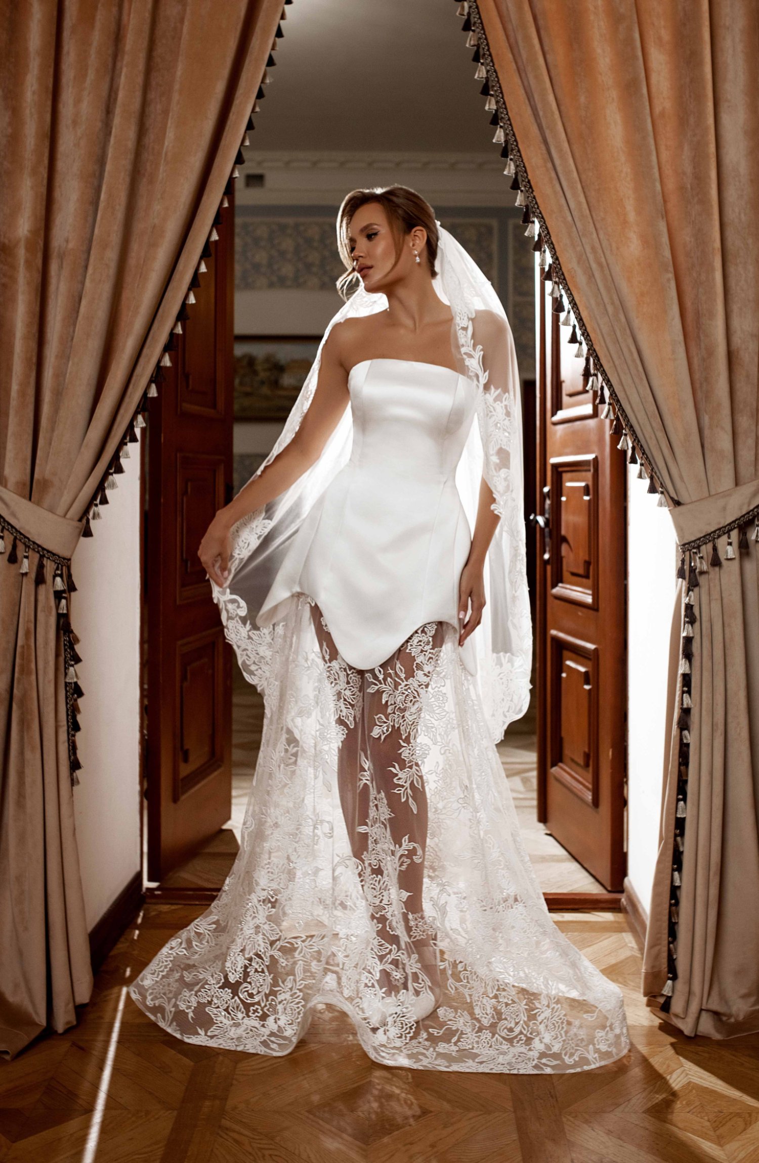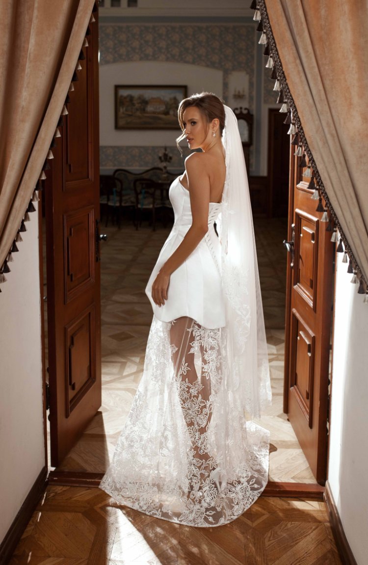 Платье свадебное - трансформер. Состоит из мини платья из атласа классического и съёмной юбки на резинке из гипюра.