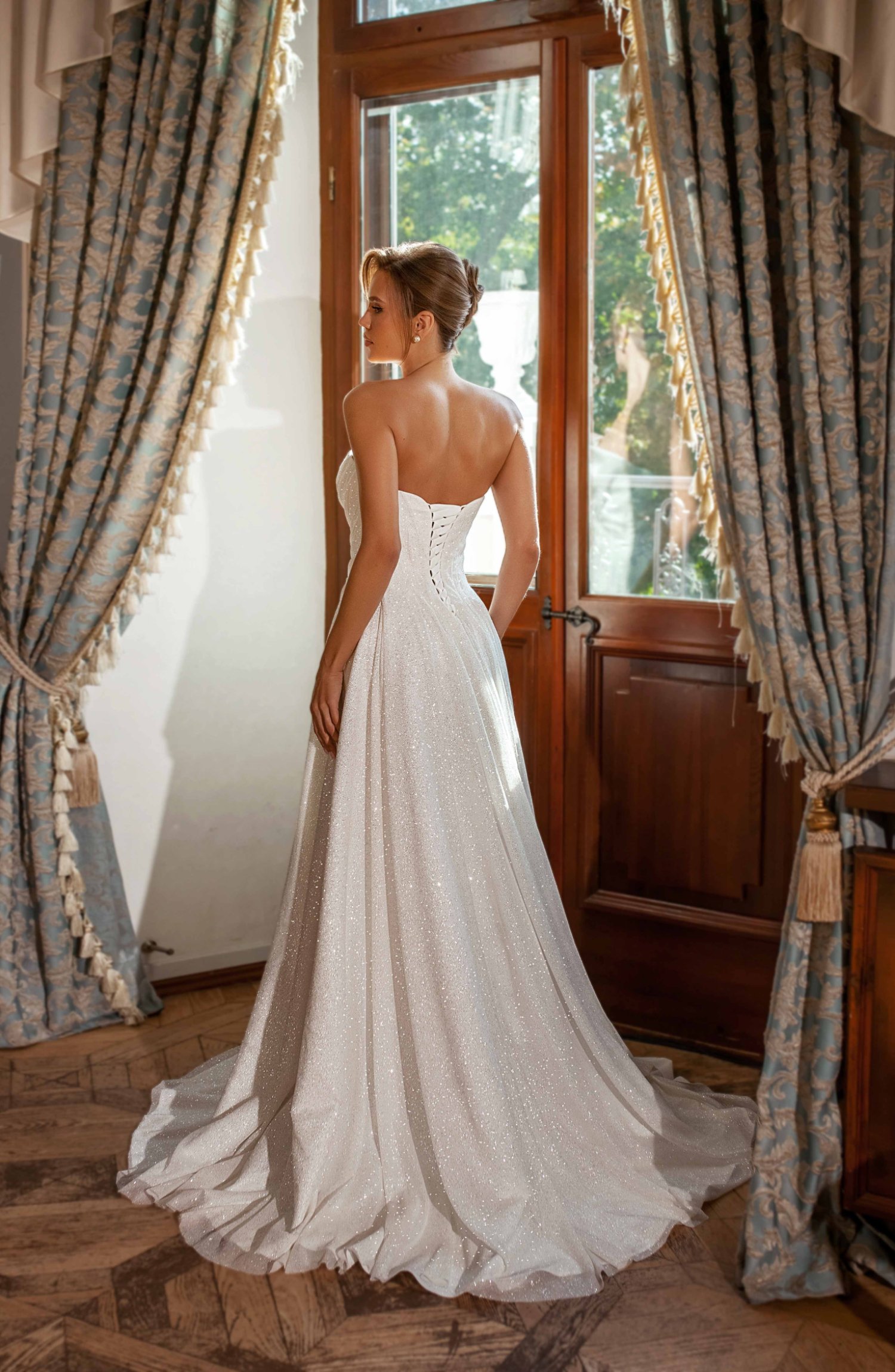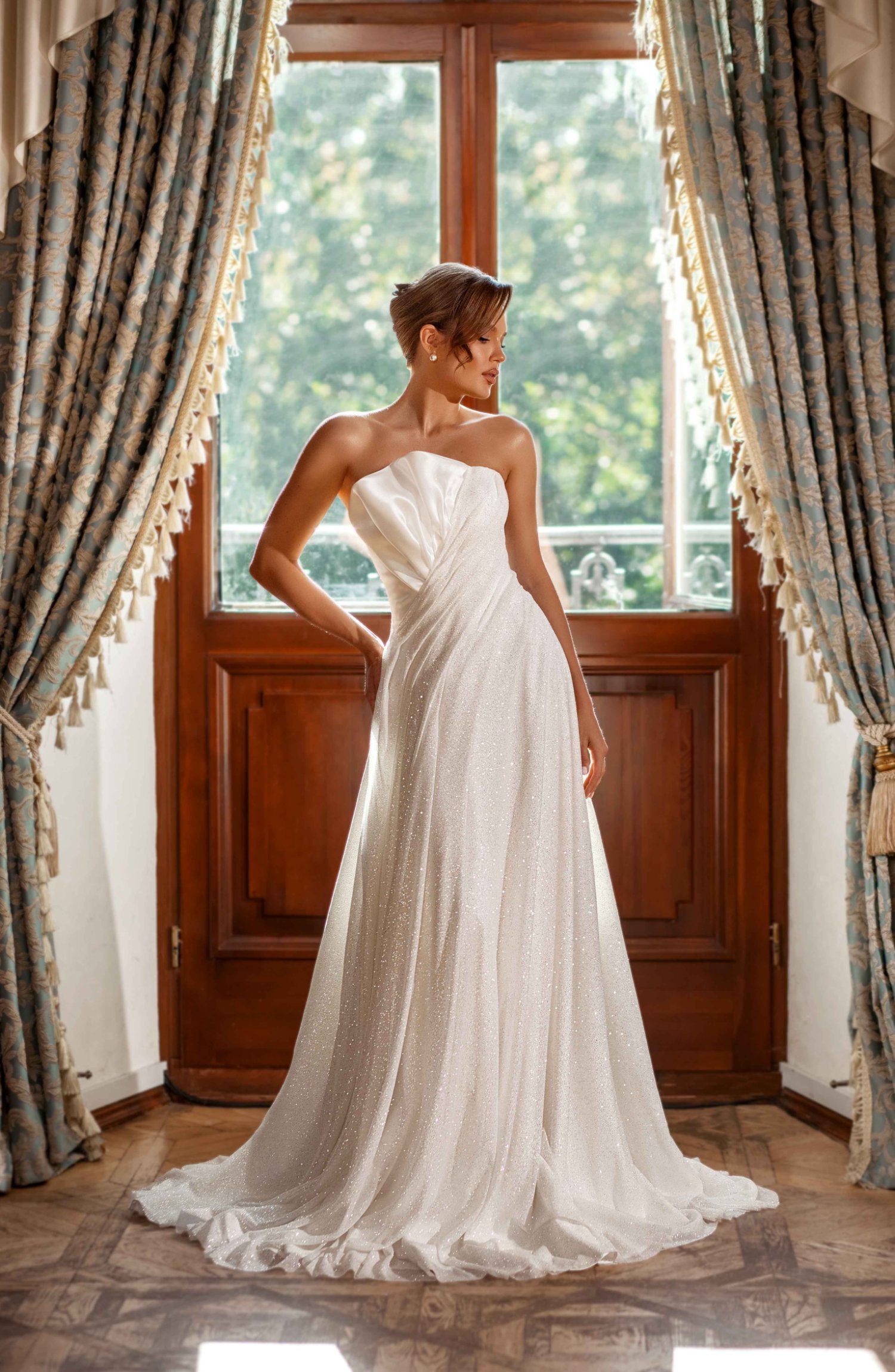 Платье свадебное, где гармония и нестандартное решение модельера идеально сочетаются ! Драпировка лифа из перламутровой органзы переходит в драпировку из сеточки с напылением глиттер всего платья .