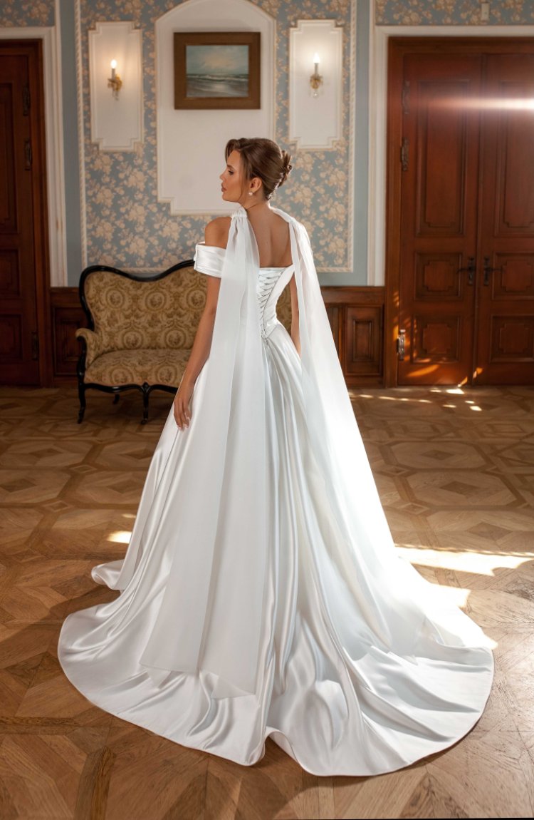 Платье свадебное в классическом стиле полностью из перламутрового атласа. Наряд дополняет шаль из восковой органзы.