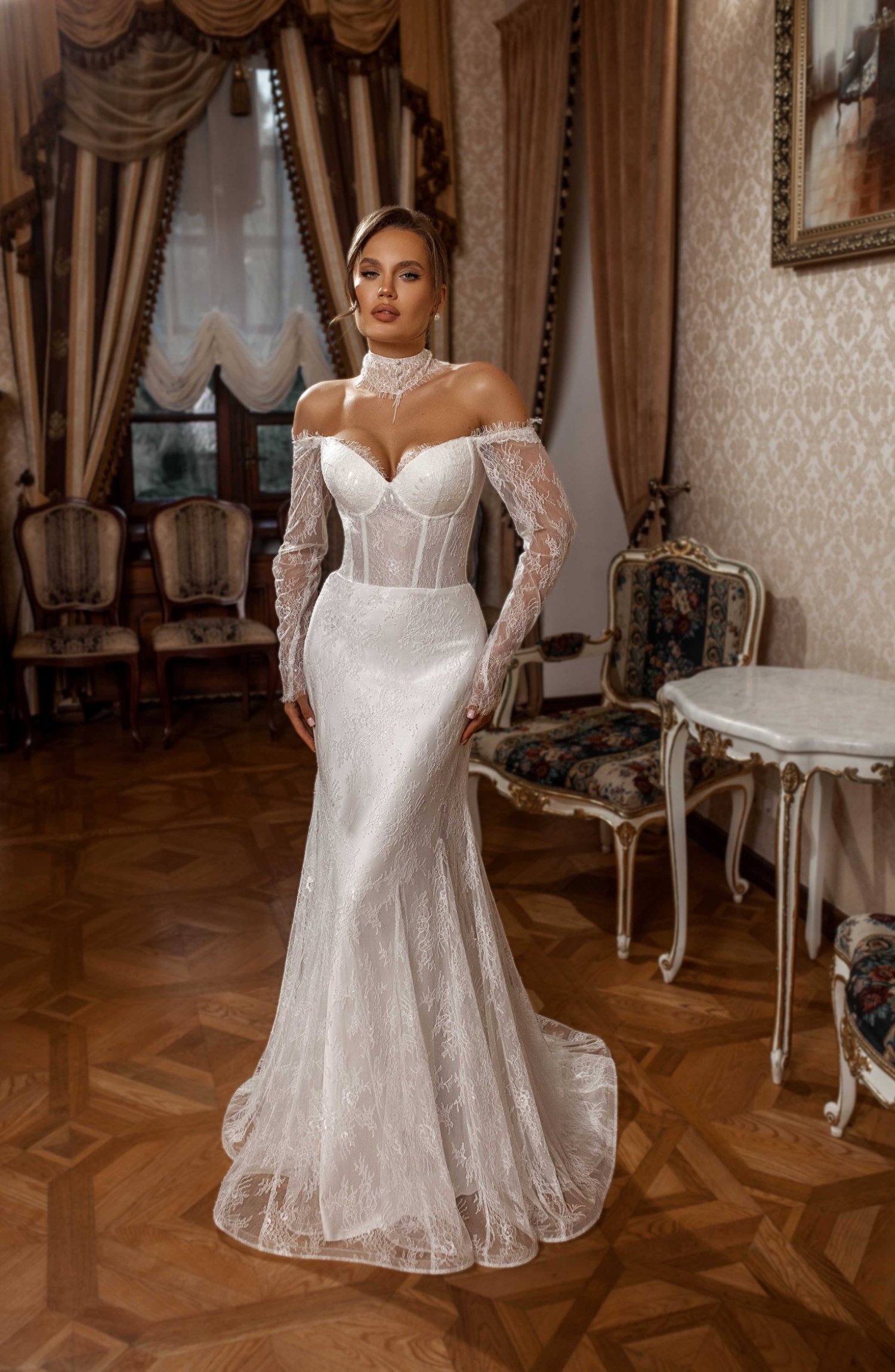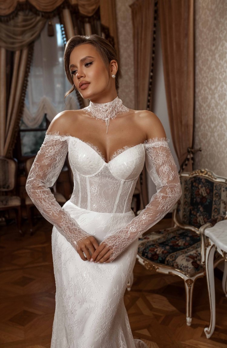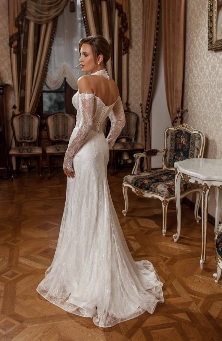 Платье свадебное для изысканных девушек. Наряд полностью покрыт шантильи и дополнен модным аксессуаром - чокер ручной работы.
