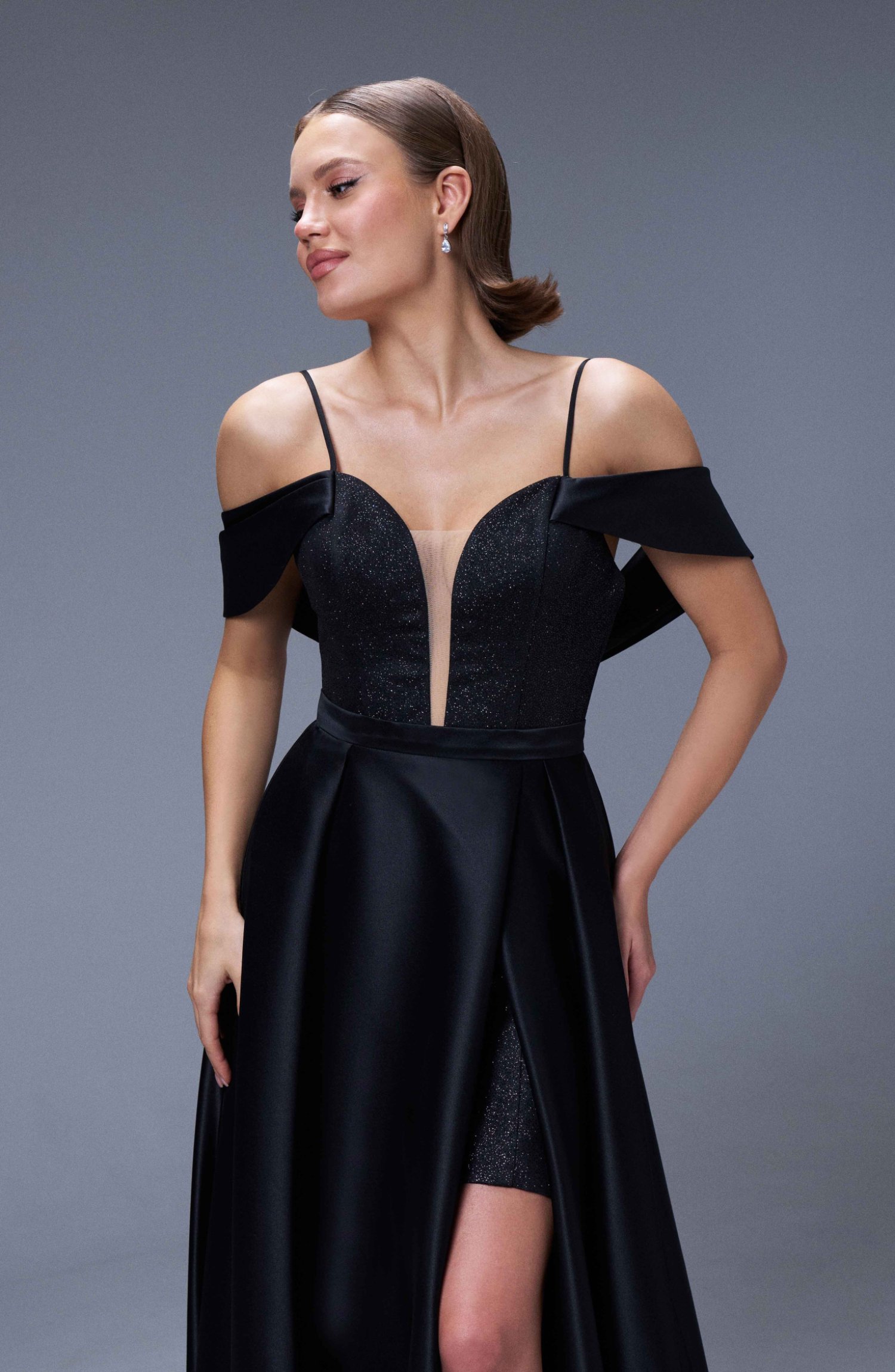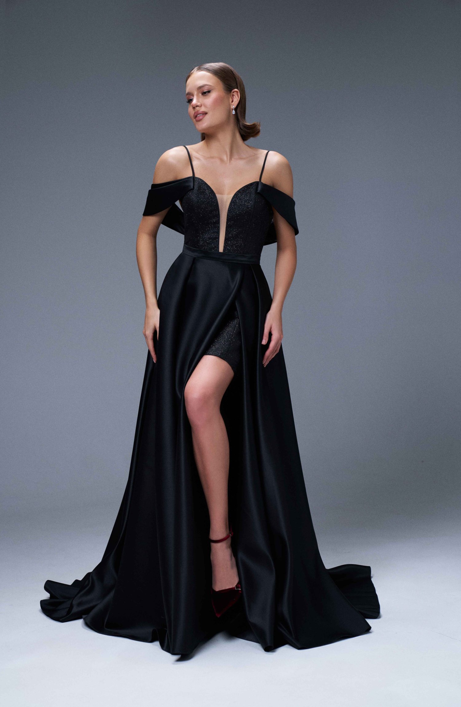Платье нарядное - трансформер , состоит из мини платья из ткани , с напылением микроглиттер и верхней ,съёмной юбки из классического атласа на поясе.