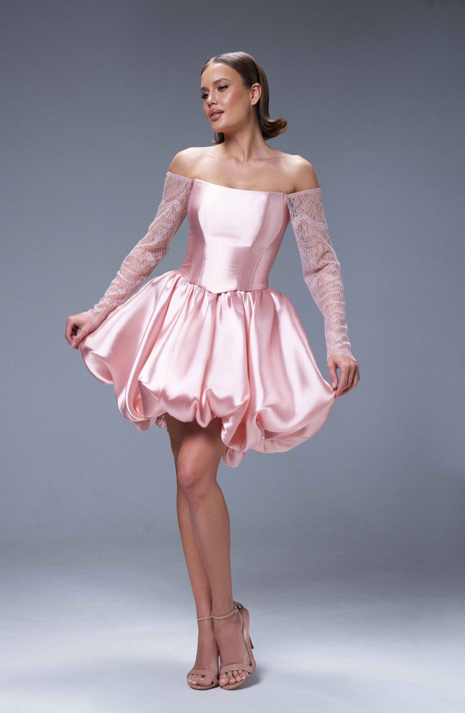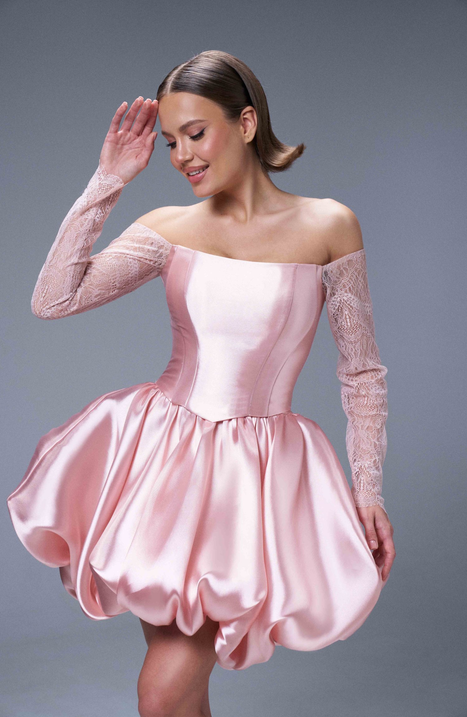 Костюм нарядный из модной ткани группы сатинов с более сложным составом и переплетениями нитей на подкладке и с рукавами из шантильи. Костюм состоит из корсета с застёжкой по центру спинки на шнуровку через петли и юбки с обтачным низом.