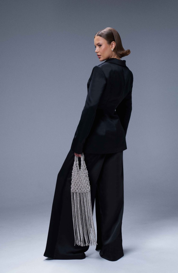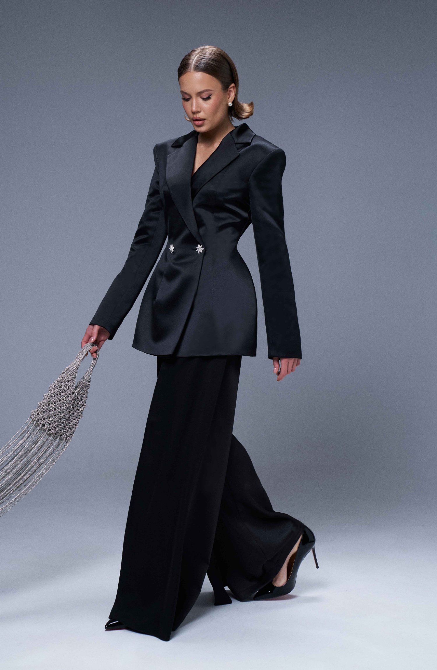 Костюм нарядный из атласа плоного в сочетании с мягким атласом на лацканах , на подкладке. Брюки из из мягкого атласа с модными элементами из шифона по переднему полотнищу.
